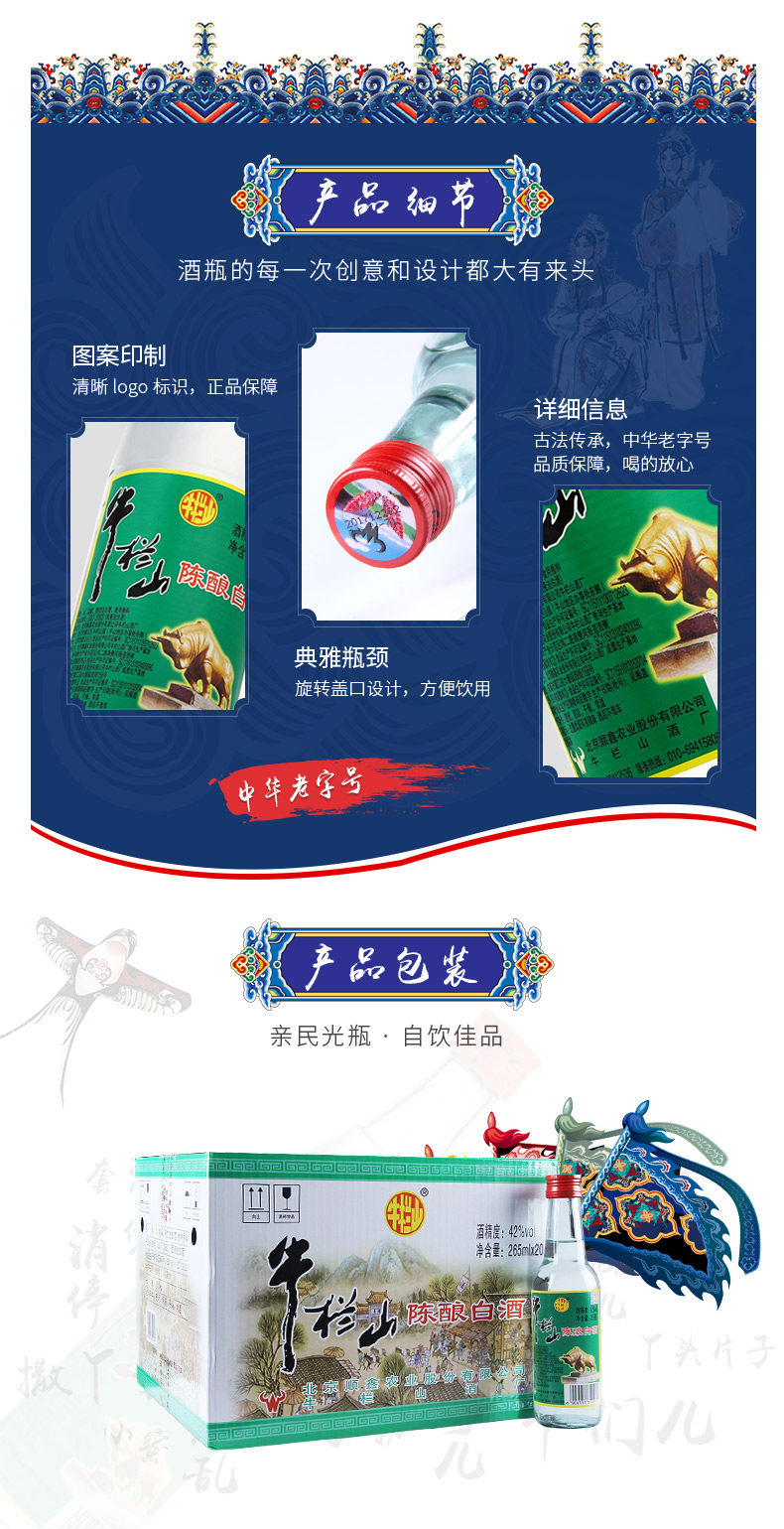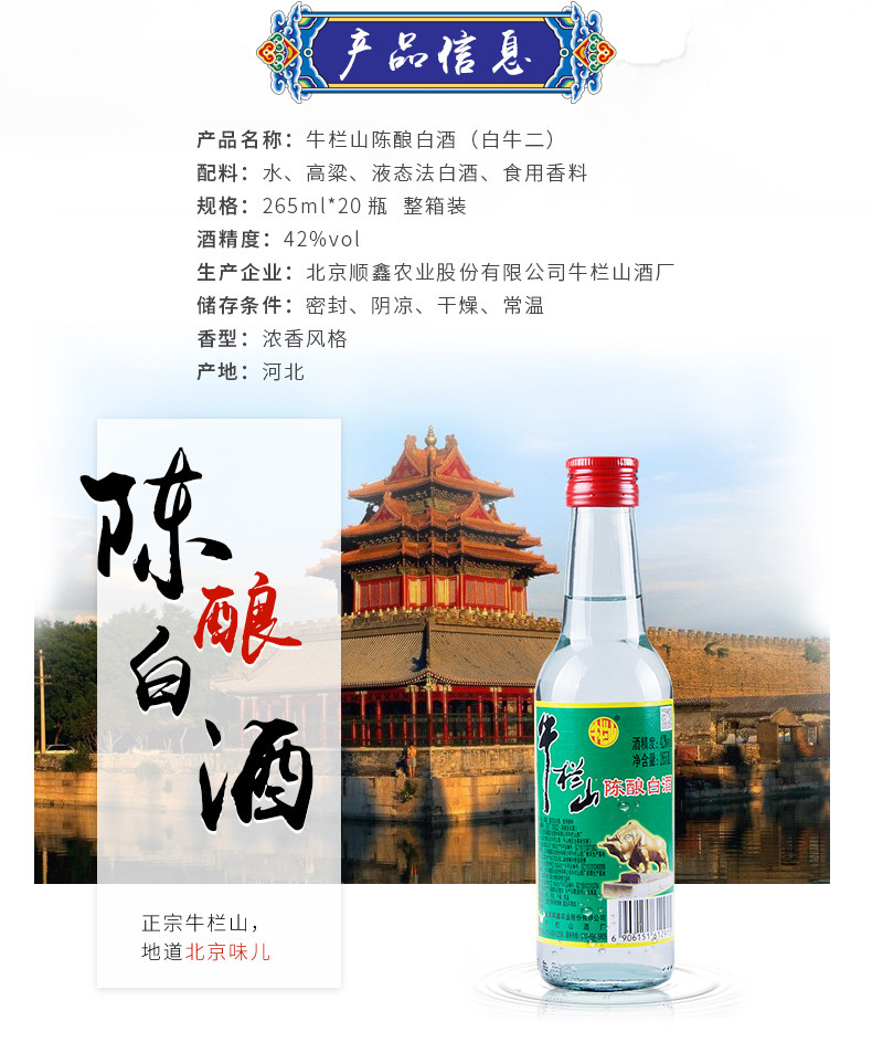 • 商品名称:牛栏山二锅头42度陈酿半斤白瓶白牛二265ml*20瓶整箱装浓香型白酒