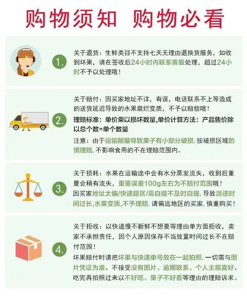 3.生鲜水果一经发货不支持退换、改地址、不支持拒收;我们坏果、少量包赔,收到有问题24小时内联系客服处理赔偿,超过24小时不售后哦!口感和延迟收货不在售后范围内,介意者慎拍!