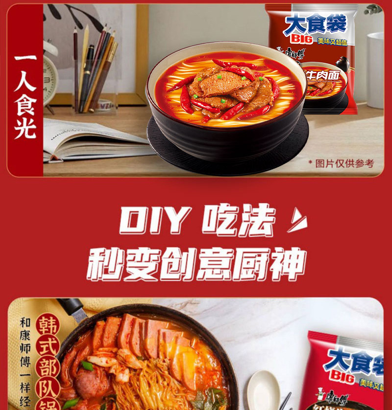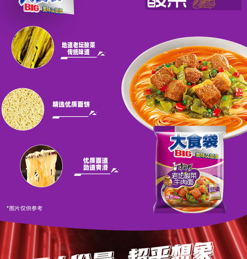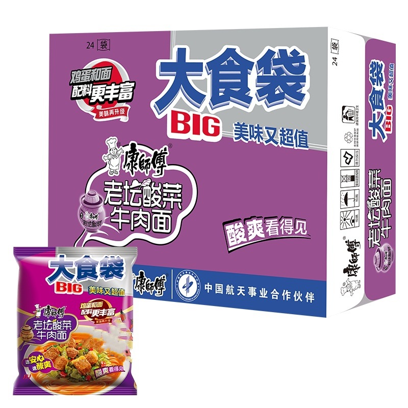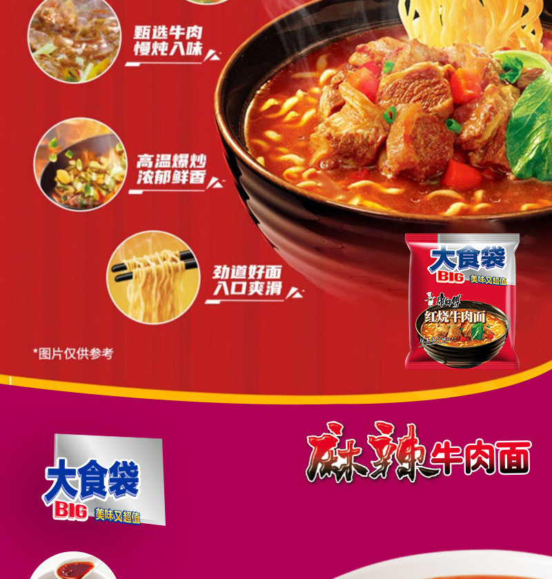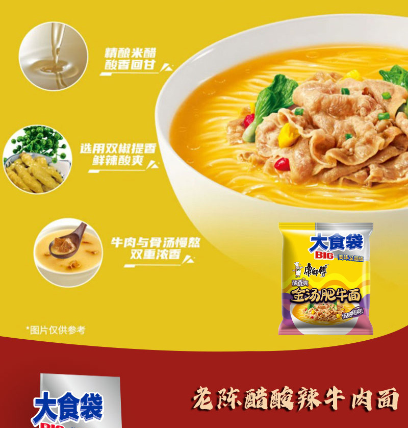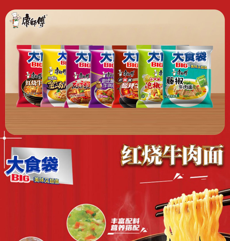 • 商品名称:康师傅大食袋红烧牛肉整箱24袋酸菜麻辣方便面速食夜宵批发汤面